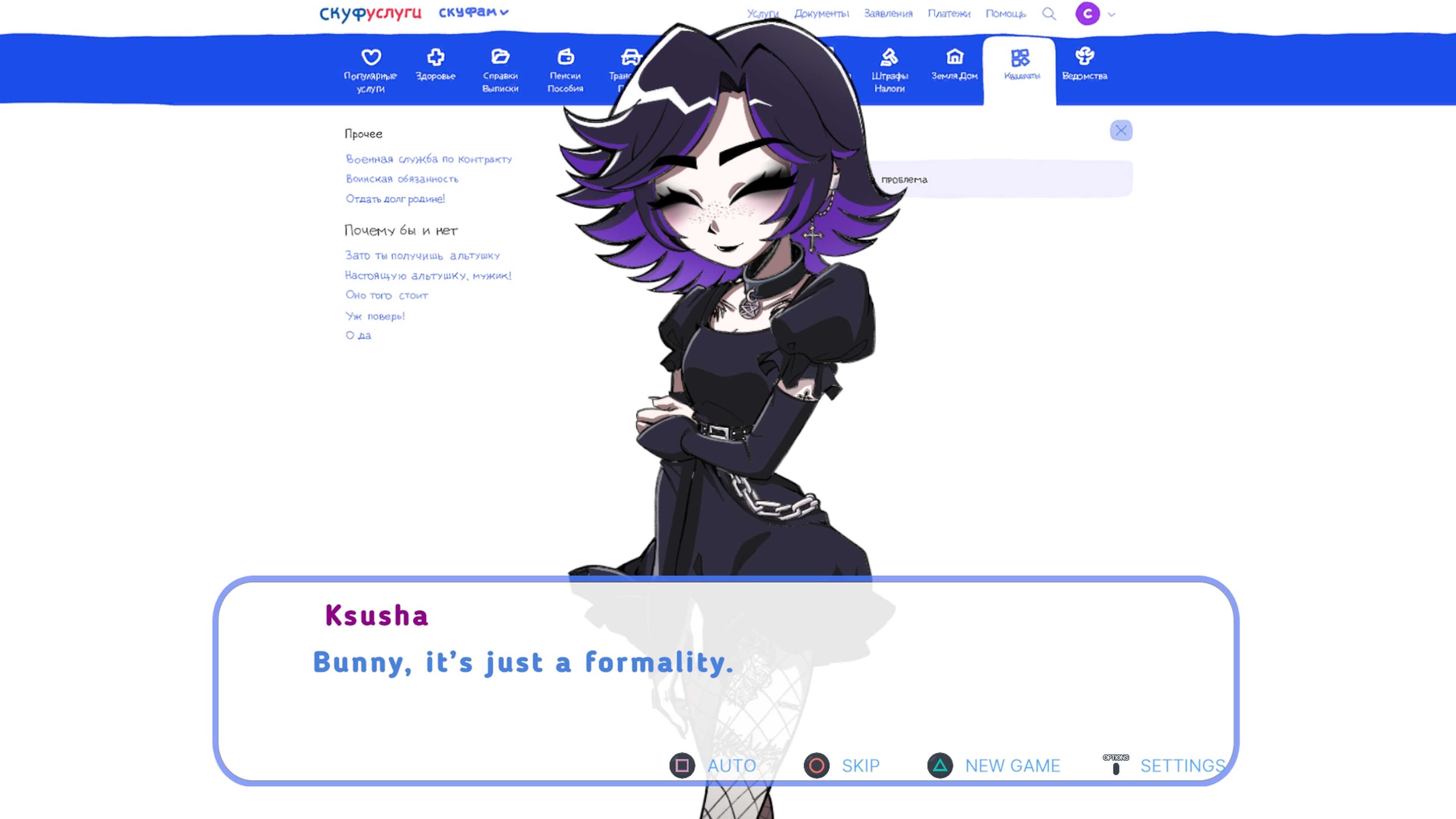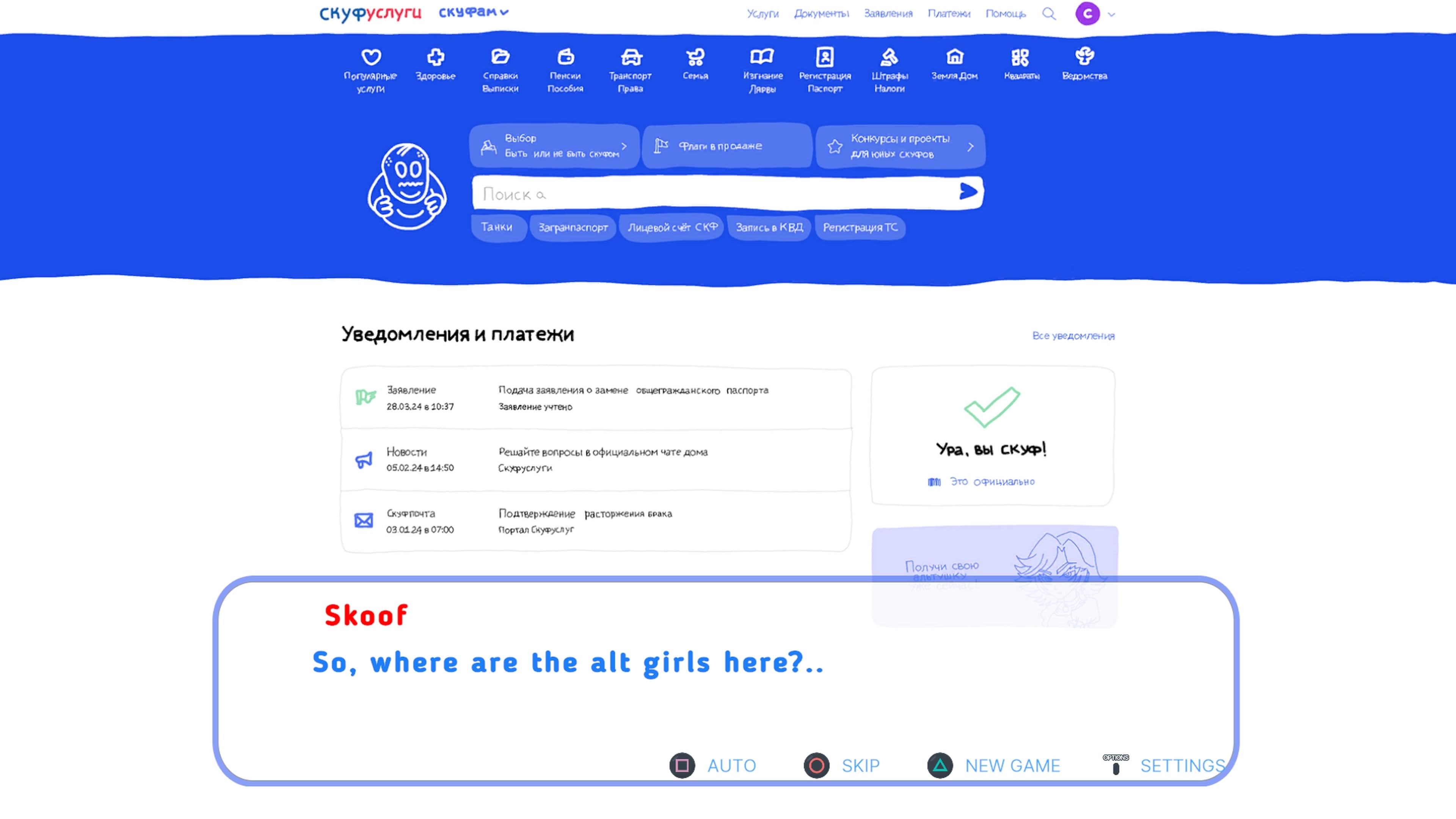 У тебя нет жены, тебе хорошо за сорок, а твоё мировоззрение крепко сформировано, но счастья в жизни всё ещё нет? Не грусти, тебе просто нужно вспомнить пароль от своего аккаунта на СкуфУслугах, и буквально через пару кликов ты сможешь получить от государства свою законную альтушку!